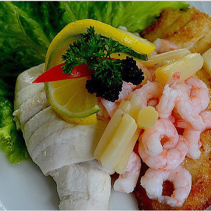 Stjerneskud m/ 2 stegte fiskefileter og 1 dampet fisk samt rejer og caviar.